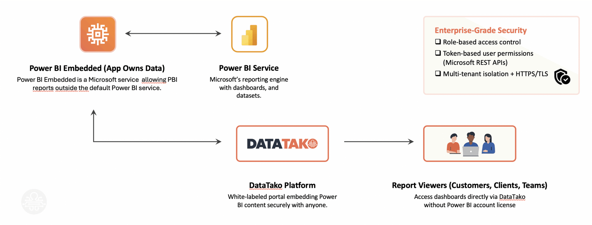 Think of it as all the benefits of Embedded + Fabric, but without the engineering burden. The image below explains how a platform like DataTako sits between the Power BI service and your report consumers.